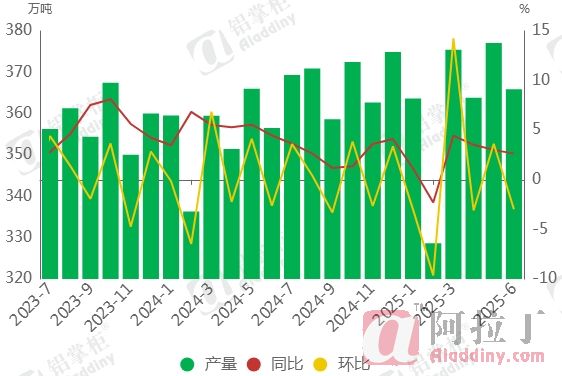 阿拉丁(ALD)发布独家调研的数据,2025年6月中国电解铝产量365.9 万吨,同比增加2.6%,当月产能利用率为98.5%。
