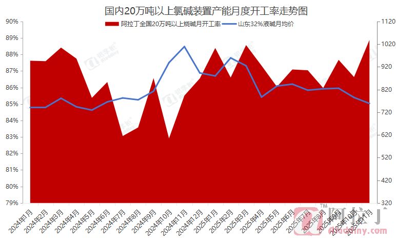 阿拉丁(ALD)调研数据显示,在11月期间,国内氯碱行业中产能达到20万吨及以上的工厂,其烧碱总产能规模为4483万吨,当月实际投入运行的产能是3984.7万吨,开工率达到88.88%,环比提升2.25%,与去年同期相比则提升3.95%。