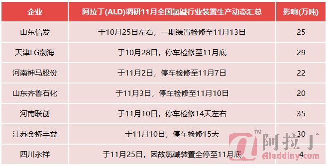 进入11月,国内处于检修状态的氯碱工厂数量大幅减少,仅有7家仍在检修。同时,有5家氯碱工厂生产负荷有所下降,分别是山东海化、山东恒通,以及浙江巨化、杭州电化、浙江嘉化。