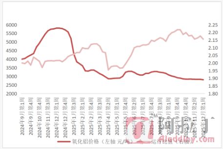 本周氧化铝盘面价格加速下跌。截至12月5日15:00时,氧化铝主力合约2601收于2555元/吨,较上周跌152元/吨,周度高点2733元/吨,周度低点2551元/吨,持仓32.7万手。详见图2。