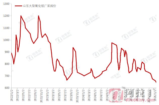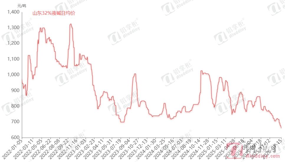 据阿拉丁(ALD)数据显示,2025年9月12日山东32%液碱日均价从862.5元/吨,便开始震荡下跌。期间虽有过小幅反弹,但大多是在价格降至一定低位后,贸易商及下游企业逢低采购引发的低位小幅回升,并非真正意义上的反转上涨。到2026年1月16日,跌势已持续5个多月。山东大型氧化铝工厂32%液碱采购价格从9月13日的800元/吨跌至当前的645元/吨,累计下跌155元/吨。