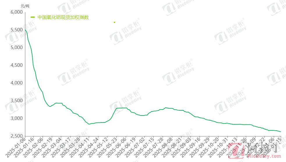 需求萎缩主要体现在氧化铝行业和镍钴行业。阿拉丁(ALD)数据显示,国内氧化铝行业加权指数从年初的5477.3元/吨降至12月底的2668.5元/吨,累计下跌2808.8元/吨。氧化铝产品价格下跌,企业处于亏损经营状态,矿及碱价格也承压运行。阿拉丁中国进口矿石综合价格指数从年初的90.5美元/吨一路下滑,至12月底降至59美元/吨,累计下降31.5美元/吨。